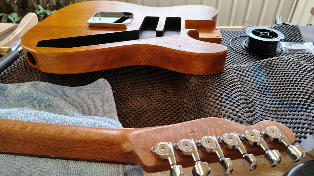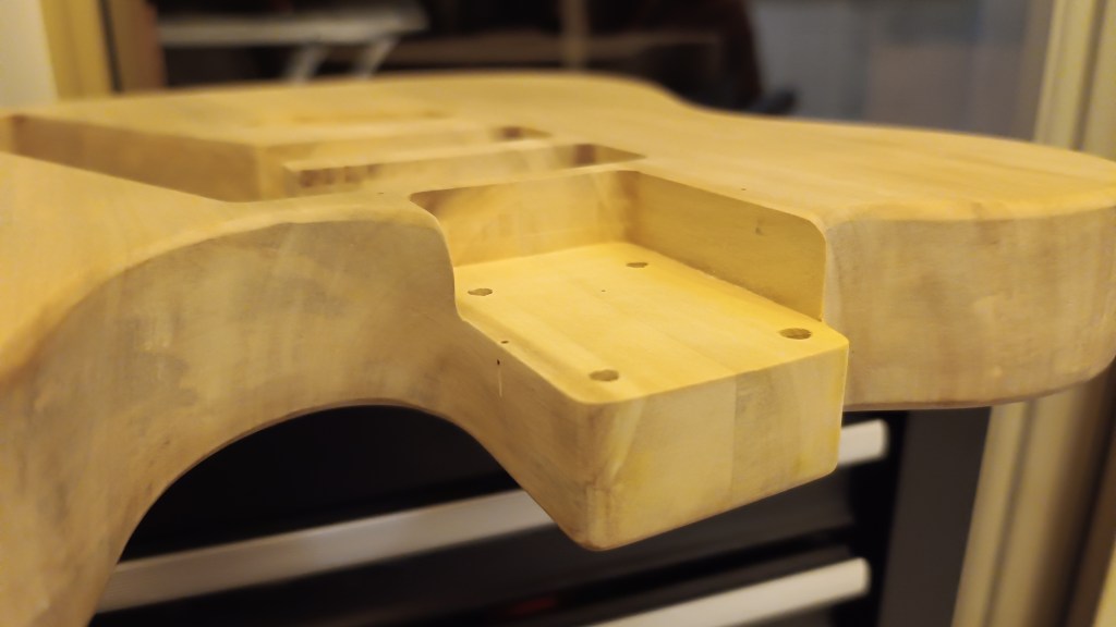 I stained it transparent amber as a nod to the ultimate guitar – the blackguard tele. It creates beautiful contrast with the black pickguard. The body is finished with a very thin layer of a semi-satin wipe-on poly.