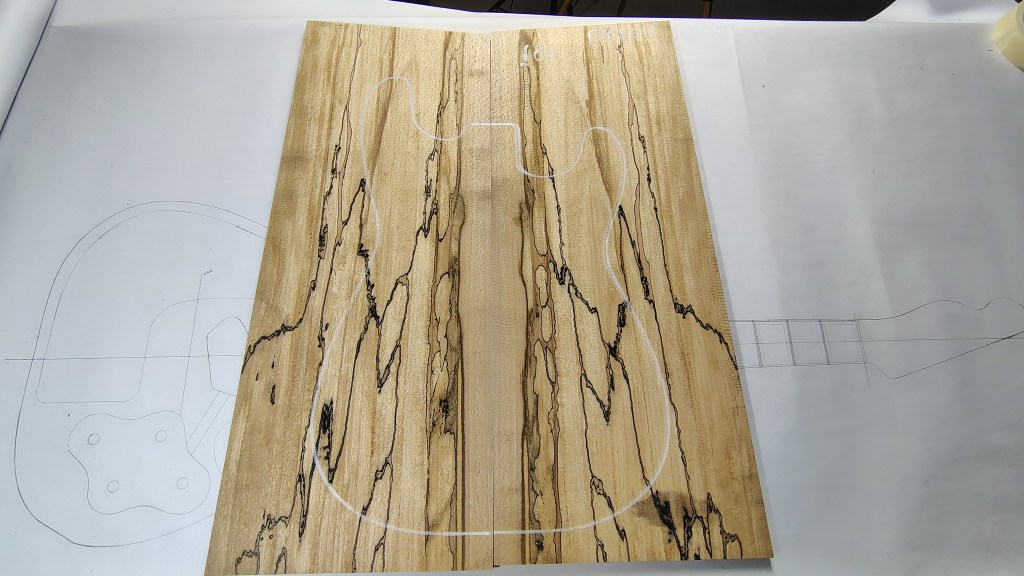 Bookmatched spalted beech – this one’s from Crimson Guitars, weighing in at 1.13kg. The spalting is wild but balanced, and the grain lines are already telling a story. Should make for an interesting top.